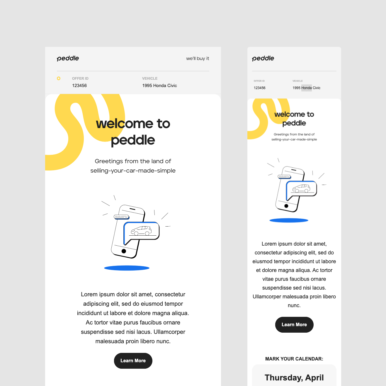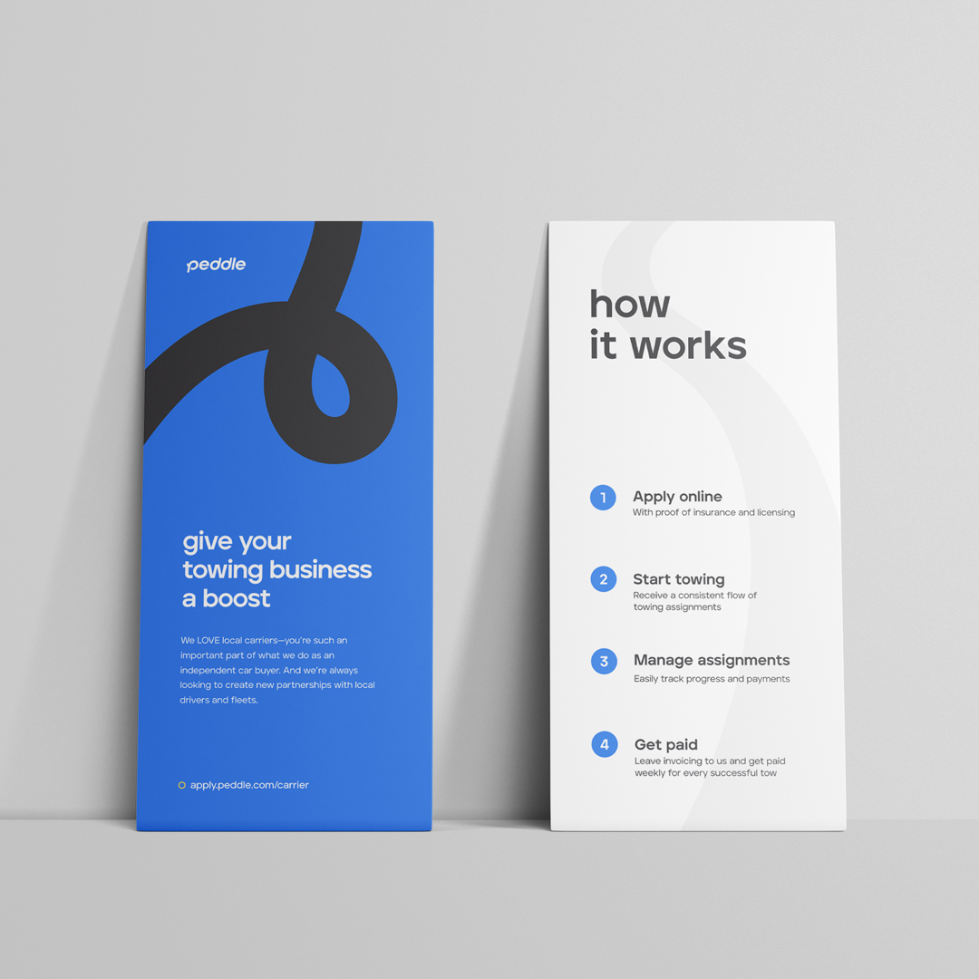 A rebrand project for Peddle.com, an online used car buying network. Working with the team at Handsome I was able to contribute to several components of the new Peddle experience. Projects included logo & branding, design system elements, email templates, motion graphics, and even 3D rendering.